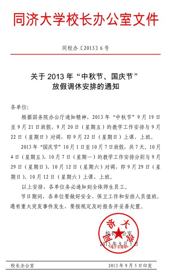 关于2013年“中秋节、国庆节”放假调休安排的通知