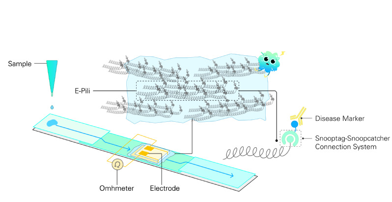 目前普遍认为其导电能力的来源为其中高密度的芳香族氨基酸的芳香环产生的pi-pi堆积作用。基于这种材料本身的诸多优点和特点,今年Tongji-China队伍分析了其蛋白质结构,在其内部单体的羧基端进行抗原表位标签修饰,最终使其可以特异性地结合指定的抗体。这种结合会改变菌毛表面的电荷分布情况,进而改变其内部芳香环的取向和间距,最终导致菌毛的电导率发生改变。