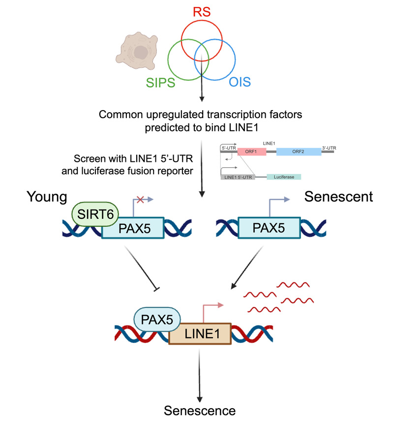 图 筛选LINE1调控转录因子及PAX5调控LINE1促进细胞衰老模式图