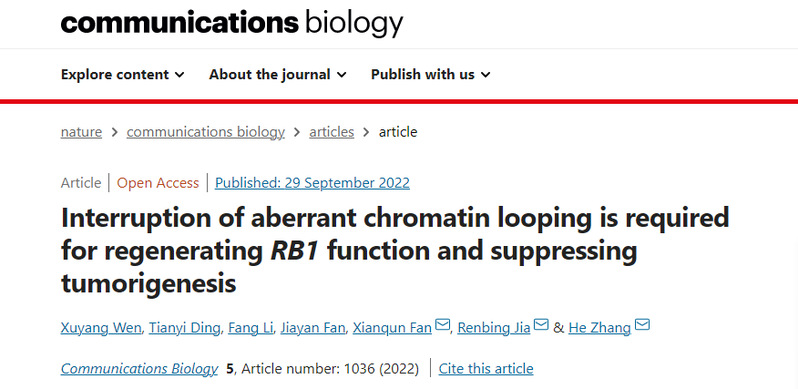 2022年9月29日,viphjc888黄金城生命学院张赫教授团队联合上海交通大学医学院范先群院士团队在Nature系列杂志Communications Biology上发表题为Interruption of aberrant chromatin looping is required for regenerating RB1 function and suppressing tumorigenesis的研究论文。该研究首次揭示了独立于基因突变的RB1功能再生新机制,率先发现阻断异常染色质环能直接恢复RB1转录表达并显著抑制肿瘤发生,建立了靶向异常染色质环的小分子化合物肿瘤治疗模型,为染色体构象重塑在肿瘤发生中的作用机制带来了新认识。