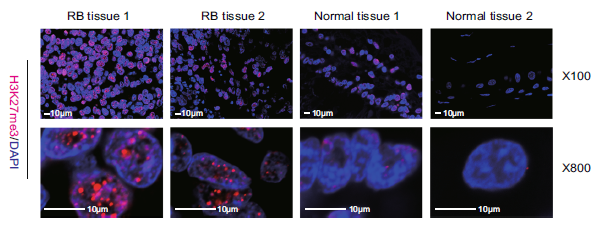 团队利用前期建立的染色体构象识别和功能研究平台,在肿瘤细胞中发现了RB1启动子与下游远端抑制子之间CTCF-PRC2复合物参与形成的特定染色质环,一旦形成染色质环的核心基因组片段被CRISPR/Cas9编辑删除和破坏,结合在染色质环形成区域的CTCF-PRC2复合物被释放,造成RB1启动子处的H3K27me3水平显著降低,解除了RB1的转录抑制,促进pRB表达并抑制肿瘤发生。