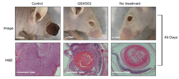 基于以上发现,进一步采用EZH2小分子抑制剂GSK503作为治疗化合物,靶向破坏肿瘤细胞中CTCF-EZH2介导的异常染色质环,结果发现GSK503有效阻断RB1调控区异常染色质环生成,促进RB1转录,抑制肿瘤发生,取得较好的肿瘤细胞靶向杀伤效果。