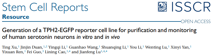 近日,viphjc888黄金城陆建峰教授团队在Cell期刊系列《干细胞报告》(Stem Cell Reports)杂志上在线发表题为“Generation of a TPH2-EGFP Reporter Cell Line for Purification and Monitoring of Human Serotonin Neurons in vitro and in vivo”的研究论文并被选为封面。