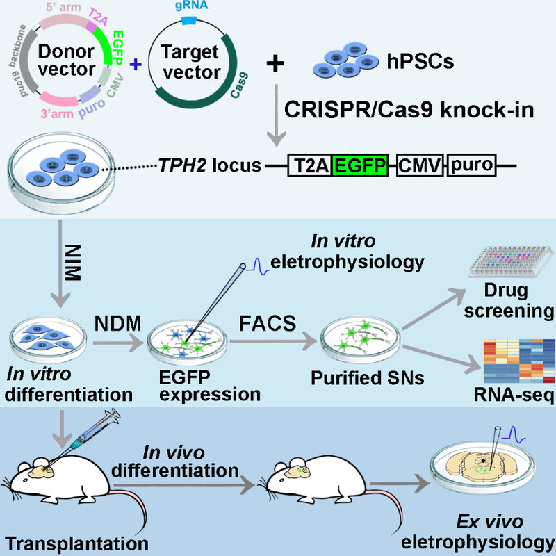 该研究应用CRISPR/Cas9技术将人类多能干细胞的TPH2基因的终止密码子之前靶向插入T2A-EGFP-CMV-PuroR报告基因片段。基因编辑后的多能干细胞在分化为表达TPH2的成熟血清素神经元时就会启动绿色荧光蛋白GFP的表达。基于该系统可以获得达95%纯度的人类血清素神经元,这一纯化的细胞体系较混杂的血清素神经元体系对促血清素释放类药物产生更高更敏感的药物学反应。该团队也首次对高纯度的人类血清素神经元进行了全基因组水平的基因表达差异研究分析。体内研究显示,移植到小鼠大脑中缝背核的血清素神经前体也可以成功分化为表达GFP的成熟血清素神经元,并为细胞在脑内的示踪、定位和神经电生理检测提供了极大的便利。该项研究的完成,对于人类血清素神经元及其相关疾病的模拟和机制研究、相关药物的验证和筛选,以及基于血清素神经元的细胞移植治疗有着非常重要及深远的意义。