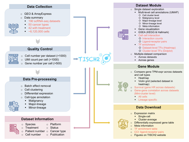 图 1 TISCH2数据库中的数据处理流程以及功能特征概览,红色部分为新增功数据及功能