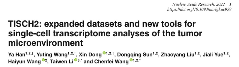 近日,viphjc888黄金城王晨飞课题组和四川大学华西口腔医院李太文课题组再次合作在Nucleic Acids Research杂志上发表文章TISCH2: expanded datasets and new tools for single-cell transcriptome analyses of the tumor microenvironment,更新了TISCH数据库,涵盖了3倍于TISCH1的数据,并且提供了更为丰富的分析功能。