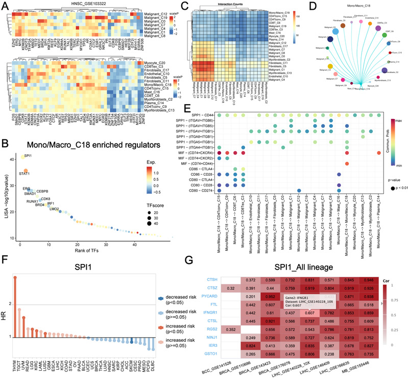 TISCH2提供了两个功能模块,数据集模块和基因模块。通过数据集模块,用户可以搜索感兴趣的数据集并进行深入的探究。为方便用户再利用数据,TISCH2对每套数据都提供了单细胞水平的表达谱以及相应的细胞类型注释、样本信息以供下载。同时,TISCH2支持多套数据互相比较,以探究不同数据集间的细胞组成以及基因表达的差异性。对于每套数据集,TISCH2提供了丰富的可视化结果以反映肿瘤微环境的细胞组成,用户可以研究基因在不同细胞、不同治疗组的表达分布特征、细胞的功能状态等信息。对于免疫治疗的数据,TISHC2提供了不同的治疗或者响应组之间细胞组成的比较、差异表达基因的分析、免疫治疗相关基因集合的表达。除了基础的功能外,TISCH2 还提供了细胞之间相互作用和转录调控的分析结果,文章以一套头颈癌[4]的数据为例,展示了数据集模块的具体用法。为了识别细胞类型特异的转录因子,TISCH2使用LISA算法[5]来推测在每种细胞群中调控基因表达的转录因子,并使用热图来展示数据集中所有细胞群各自的关键转录因子(图2A)和每个细胞群内部的关键转录因子(图2B)。肿瘤微环境中细胞间的相互作用,不仅可以调控细胞自身的功能,也会影响周围的免疫微环境从而影响肿瘤的发生发展。TISCH2使用CellChat[6]来推测不同细胞间的相互作用情况,和展示了细胞群之间两两相互作用的基因对的数目(图2C),同时描绘了特定细胞群和其他细胞群的相互作用的概率(图2D)和具体的基因对之间相互作用的概率(图2E)。