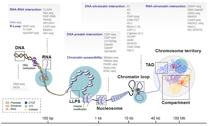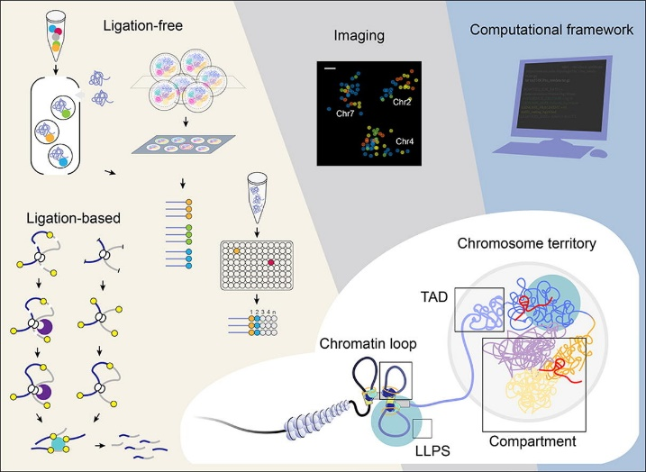 基因表达和细胞命运决定需要精确和协调的表观遗传调控,复杂的染色质三维(3D)重塑在生命过程中发挥着关键作用。染色质3D重塑的多层次结构,包括染色质环(chromatin loops)、拓扑相关结构域(TADs)、染色质区室(chromatin compartments)和相分离(phase separation),共同调节染色质状态和转录活性。近年来借助3D基因组信息学,基于不同策略的生物化学和成像方法已经进展到能从单细胞水平揭示生物大分子之间的相互作用。