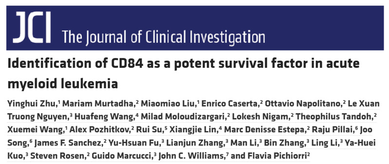近日,viphjc888黄金城祝颖慧团队和美国City of Hope医疗中心 Flavia Pichiorri 团队在 The Journal of Clinical Investigation 发表了题为 Identification of CD84 as a potent survival factor in acute myeloid leukemia 的研究论文,该研究首次明确CD84是AML中特异性高表达的膜表面分子靶点,并揭示其作为AML关键生存调控因子的重要作用。敲降CD84可显著抑制AML细胞增殖,延长异种移植小鼠的生存期,机制上,CD84通过维持AML细胞的线粒体功能和抗氧化防御,促进其生存与疾病进展。该研究揭示了一种新型细胞表面分子调控AML发生发展的功能和作用机制,同时为AML治疗提供新靶点和新思路。目前,相关免疫治疗的临床转化研究正在推进中。