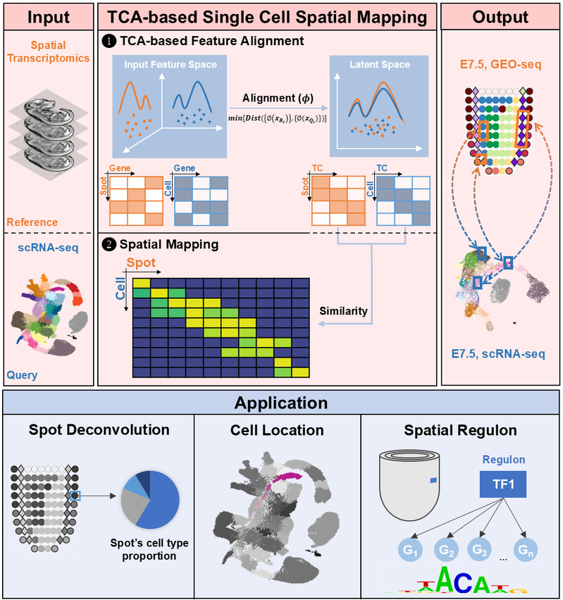 器官干/前体命运决定高度依赖于其空间位置。然而,传统方法缺乏原位单细胞精度的空间解析能力,难以精确鉴定不同前体细胞亚群及其空间分布模式。为破解这一难题,研究团队提出了一种基于转移成分分析(TCA)的整合策略SEU-TCA,通过单细胞RNA测序(scRNA-seq)和空间转录组(ST)数据联合分析,实现了单细胞精准空间映射。团队使用来自不同技术平台的多种生物样本(小鼠原肠胚、人类心脏、小鼠嗅球、人类胰腺导管癌),系统评估了SEU-TCA的性能并对比其他算法,证明了SEU-TCA优异的空间解卷积与单细胞定位能力。特别是在小鼠E7.5胚胎的scRNA-seq数据与空间图谱整合中,SEU-TCA成功建立了基因表达水平与空间位置的关联,进而揭示了多种空间特异性的中胚层细胞亚型。