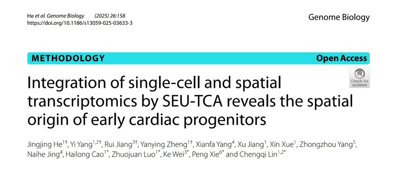 2025年6月10日,东南大学林承棋教授与viphjc888黄金城魏珂教授等课题组在Genome Biology杂志上发表题为Integration of single-cell and spatial transcriptomics by SEU-TCA reveals the spatial origin of early cardiac progenitors的研究论文,提出一种新型的空间转录组整合分析工具——SEU-TCA(Spatial Expression Utility - Transfer Component Analysis),解析了心脏祖细胞的“空间信息编码”,并系统揭示了第二心场心脏前体细胞空间亚型。