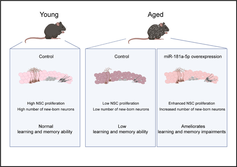 衰老是一种进行性退化状态,通常伴随着认知能力下降和记忆缺陷。海马是与空间学习和记忆密切相关的脑区,位于海马齿状回亚颗粒区的神经干细胞(NSCs)对于海马的功能至关重要。以往研究表明海马NSCs的增殖随着年龄的增长而下降,这与学习和记忆的损伤密切相关。本研究发现,与年轻小鼠相比,miR-181a-5p在老年小鼠海马NSCs中的表达降低,外源性过表达miR-181a-5p可以促进NSC的增殖,但不影响NSC向神经元和胶质细胞的分化。机制研究显示,miR-181a-5p通过靶向PTEN发挥其调控NSC增殖的作用。此外,在老年小鼠海马齿状回中过表达miR-181a-5p能够促进海马NSCs的增殖,增加新生神经元的数量,并且改善老年小鼠学习记忆能力。本研究揭示了miR-181a-5p在NSC增殖和衰老相关的学习记忆障碍中的作用,为治疗衰老相关的神经系统疾病药物研发提供了理论依据。