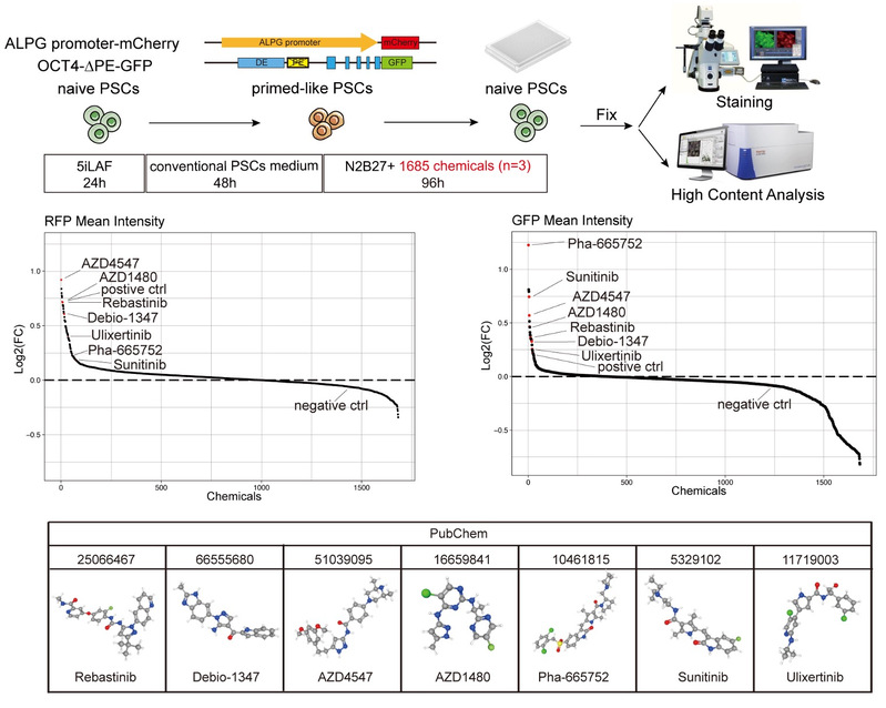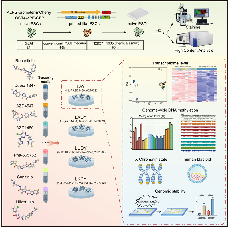 研究团队利用先前已建立的准确指征原态多能性的ALPG-promoter-RFP;OCT4-ΔPE-GFP双荧光报告系统,结合高内涵筛选体系,通过诱导培养筛选出利于人naive多能性的7种化学小分子。