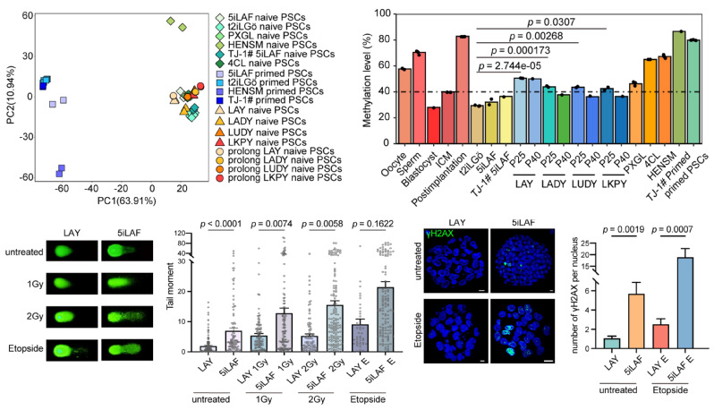 DNA损伤验证实验发现相较于于5iLAF hPSCs,LAY hPSC DNA断裂明显减少,而对于辐照或药物损伤造成的DNA损伤,LAY hPSC表现出更强的抵抗力,证实其基因组稳定性更优。除此之外通过类囊胚及小鼠胚胎嵌合实验,进一步证实LAY hPSCs有良好的发育潜能。
