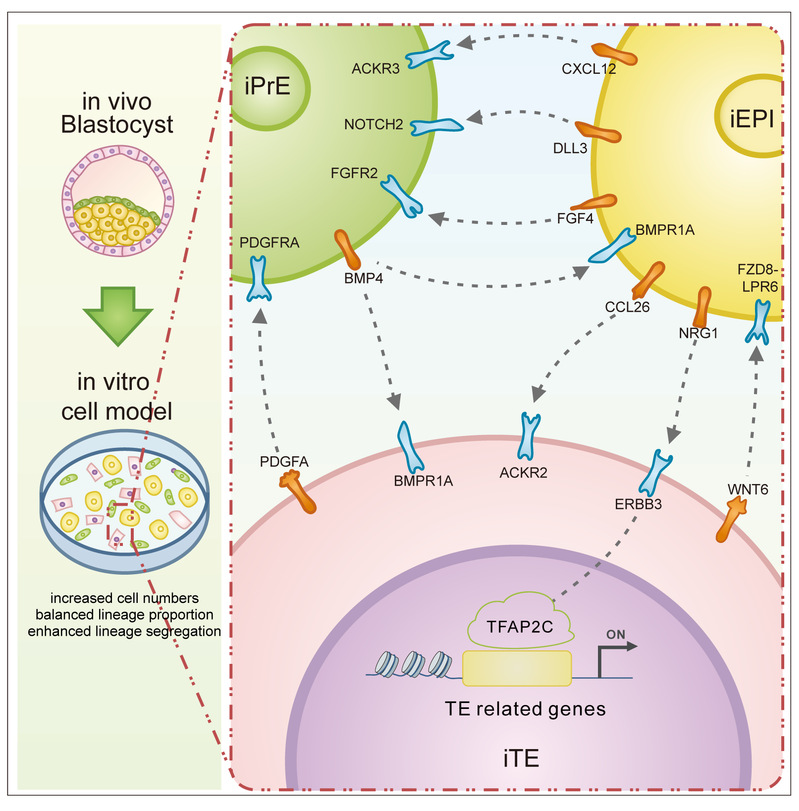 此外,该研究还结合基因共表达网络分析,确立了TFAP2C在NRG1-ERBB3通路中作为下游效应因子的核心作用,揭示NRG1-ERBB3通路通过调控TFAP2C介导TE命运的实现。本研究系统揭示了人囊胚期三谱系间的细胞通讯互作图谱,并鉴定出NRG1-ERBB3-TFAP2C信号轴作为EPI调控TE谱系命运的重要机制之一。这一发现不仅深化了人类胚胎发育早期命运决定机制的理解,也为构建更完善的人囊胚体外模型与相关疾病的研究奠定了理论基础。