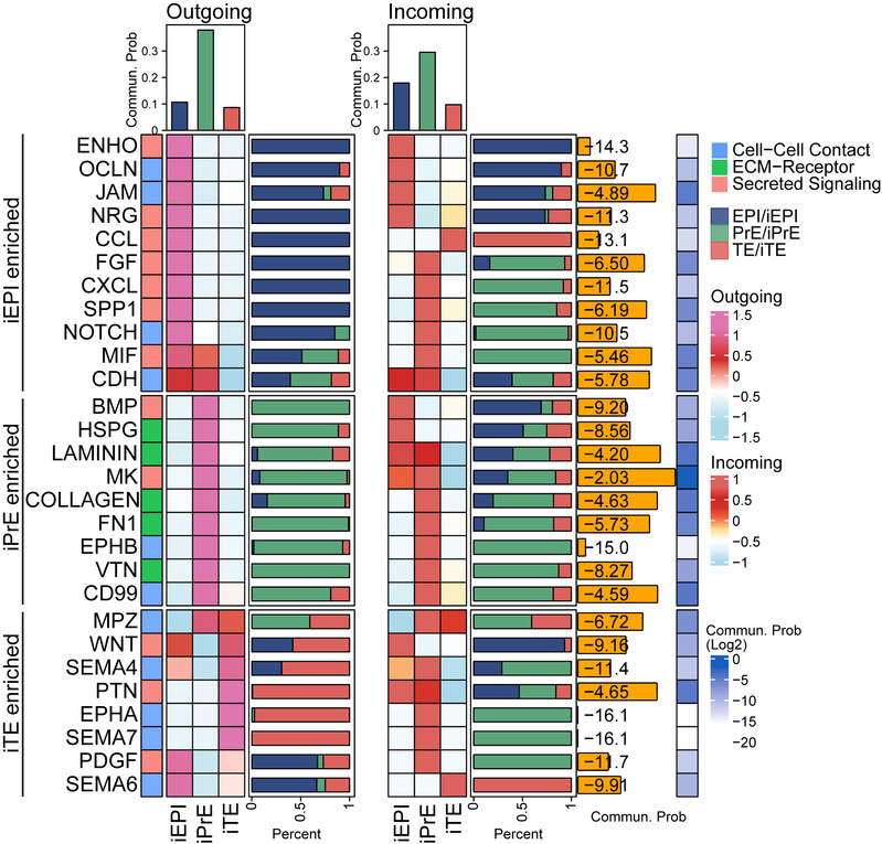 研究团队前期通过系统分析人类胚胎干细胞从primed态向naive态(primed-to-naïve)诱导过程中的单细胞转录组数据,绘制了高分辨率的细胞命运转变图谱,发现在诱导第8天会同时出现分别具有人植入前EPI、TE和PrE三胚层谱系特征的中间细胞亚群 (iEPI、iTE、iPrE)。进一步借助CellChat细胞互作分析工具,研究团队系统绘制了人囊胚期三胚层间的复杂细胞通讯互作网络,涵盖多种分泌型、细胞-细胞接触型及细胞外基质互作类信号通路。