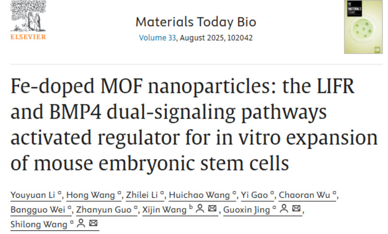 2025年7月7日,汪世龙教授课题组在线发表题为“Fe-doped MOF nanoparticles: the LIFR and BMP4 dual-signaling pathways activated regulator for in vitro expansion of mouse embryonic stem cells”的研究论文。本项研究成功合成了以Fe3+为金属中心离子,2-甲基咪唑为有机配体的金属有机框架纳米颗粒(Fe MOF)。该纳米颗粒不仅在mESCs长期培养中展现出优异的生物相容性,更能在无MEF饲养层和LIF因子的培养条件下,有效维持mESCs的自我更新能力,并完整保留其向三胚层细胞分化的潜能。