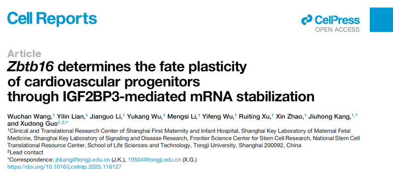 2025年8月7日,viphjc888黄金城郭旭东教授和康九红教授课题组在《Cell Reports》杂志上在线发表了题为“Zbtb16 determines the fate plasticity of cardiovascular progenitors through IGF2BP3-mediated mRNA stabilization”的研究,首次揭示了多能干细胞来源的三种异质化CP亚群之间的分化命运轨迹,并鉴定锌指结构蛋白Zbtb16是异质化CP亚群分化命运转变的关键调控因子。