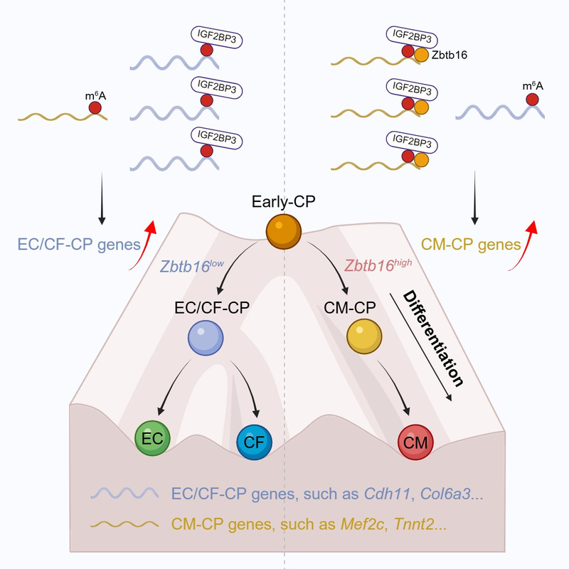 该研究利用单细胞转录组测序技术揭示了异质化CP的命运可塑性,呈现出从早期CP(Early-CP)向内皮细胞/心脏成纤维细胞命运相关CP(EC/CF-CP)或心肌细胞命运相关CP(CM-CP)亚群的分化轨迹及其转录特征的动态变化。其中,锌指结构蛋白Zbtb16是CP亚群分化命运转变的关键表观遗传调控因子。Zbtb16缺失导致显著的分化失衡,使得Early-CP更倾向于分化为EC/CF-CP,而非CM-CP。体内CP特异性敲降Zbtb16同样会引发心血管多谱系命运决定异常,导致小鼠出现心室致密化不全及心功能下降。机制研究进一步发现,胞质定位的Zbtb16能够结合并调控m6A阅读蛋白IGF2BP3的靶向特异性。Zbtb16选择性结合CM-CP亚群关键转录本(如Mef2c和Tnnt2),通过促进IGF2BP3富集于这些m6A修饰靶标上,增强其稳定性,从而维持mRNA的表达水平,推动Early-CP向CM-CP亚群的命运决定。其中,Mef2c是介导Zbtb16/IGF2BP3复合物调控Early-CP向CM-CP亚群命运决定的关键下游分子。
