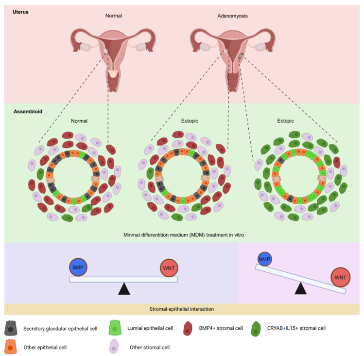 研究团队建立了模拟子宫内膜动态变化的子宫内膜-腺肌症组装体模型,在机制层面明确了 BMP/WNT信号通路失衡在子宫腺肌症发生中的核心作用,提出WNT通路作为潜在治疗靶点的新策略。