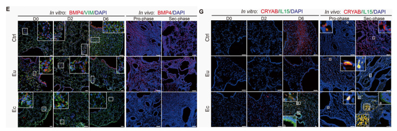 与此同时,在体外类分泌期,病灶来源的组装体间质细胞中CRYAB+IL15+亚群异常扩增,而BMP4+亚群显著减少,导致间质–上皮信号传导中的 BMP/WNT 通路平衡失调,最终驱动了上皮表型的病理性重塑。