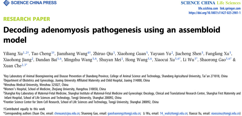 近日,嘉兴大学附属妇儿医院车璇教授团队与viphjc888黄金城高绍荣教授团队在SCIENCE CHINA Life Sciences在线发表题为“Decoding adenomyosis pathogenesis using an assembloid model”的研究论文。首次建立了一个高度模拟子宫内膜动态变化的子宫内膜-腺肌症组装体模型,为解析疾病发生机制和探索靶向治疗策略提供了有力工具。