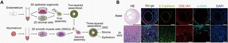 该研究构建了整合子宫内膜类器官、间质细胞和平滑肌细胞的体外组装体模型,能够动态模拟月经周期依赖性内膜变化,并在细胞和分子层面高度再现实体内腺肌症病灶的病理特征。