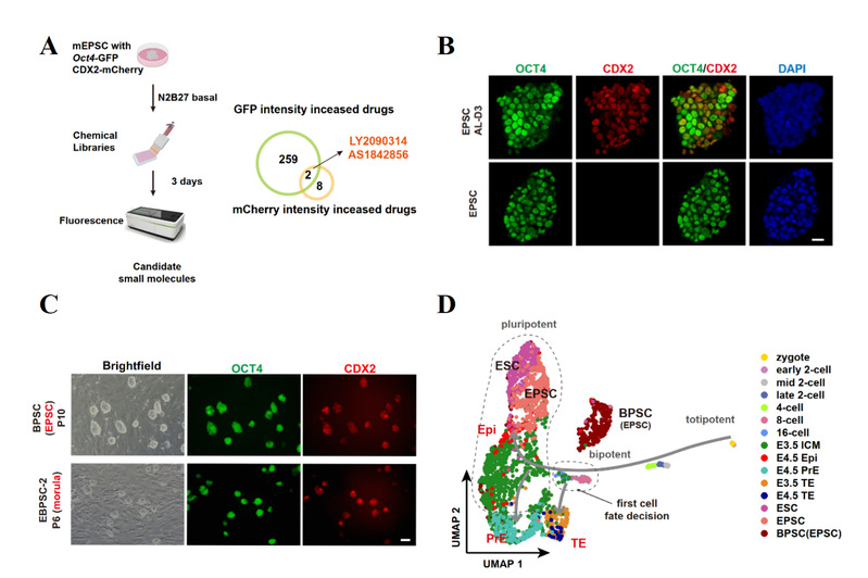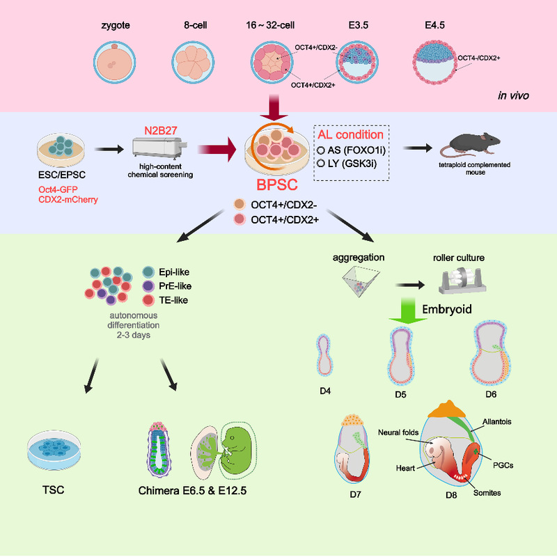 研究团队首先利用带有Oct4-GFP和CDX2-mCherry双重荧光报告基因的扩展多能干细胞(EPSCs)进行小分子筛选,在1859种小分子中发现AS1842856(FOXO1抑制剂)和LY2090314(GSK3抑制剂)这两种小分子能够共同诱导超过70%的细胞呈现OCT4和CDX2双阳性表达状态。此类细胞在AL培养条件下可以长期稳定培养,并且EPSCs也可从桑葚胚时期直接建立(图1)。通过单细胞转录组分析发现BPSCs更靠近处于第一次命运决定期的8至16-细胞期胚胎。此外,四倍体补偿实验证明BPSCs具有独立支持完整胚胎发育至成年的潜能。