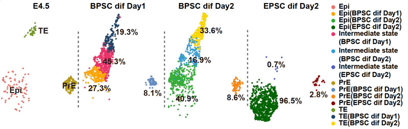 在体外自由分化实验中,研究团队进一步证明BPSCs可以在仅使用没有额外诱导因子的基础培养基条件下,于48小时内分化出CDX2阳性(33.6%)、OCT4阳性(40.9%)及GATA6阳性(8.6%)的三类细胞,三者分别对应E4.5阶段囊胚中的三大谱系。这种无需诱导即可分化为三谱系的能力验证了BPSCs具备的高度可塑性(图2)。