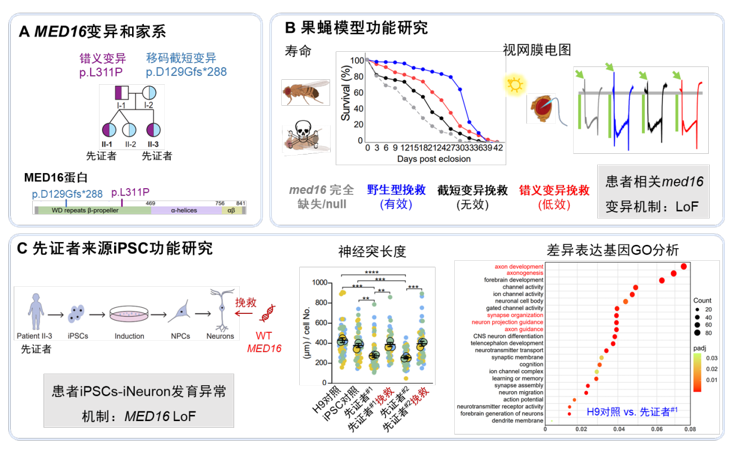 本研究通过外显子组测序,在一个非近亲婚配家系中的两名患者中,鉴定出MED16基因(NM_005481.3)的双等位基因变异,该变异分别遗传自双亲。先证者临床表现为全面发育迟缓、智力障碍及多种畸形特征。为评估变异致病性,研究团队在果蝇模型和患者来源的诱导多能干细胞(iPSCs)中进行了功能验证。果蝇中同源基因med16(通过Kozak-GAL4标记显示)在发育中的中枢神经系统神经元及部分胶质细胞中表达。med16完全缺失导致果蝇羽化率和存活率显著降低,并引起突触传递功能障碍。野生型med16回补能有效挽救上述表型,而患者来源的两种变异体挽救能力显著减弱,提示其为功能缺失型(loss-of-function, LoF)变异。