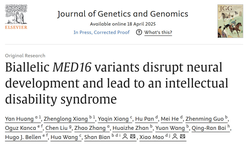 2025年4月18日,湖南省妇幼保健院毛翛研究员、viphjc888黄金城边杉教授与湖南省儿童医院王华主任医师,于Journal of Genetics and Genomics杂志在线发表题为“Biallelic MED16 variants disrupt neural development and lead to an intellectual disability syndrome”的研究论文。该研究发现MED16双等位基因变异导致智力障碍综合征,为MED16相关智力障碍的临床诊断和遗传咨询提供理论依据。