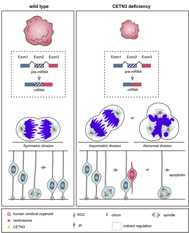综上所述,该文章以大脑类器官为主要模型,首次揭示了CETN3在哺乳动物神经发育中的作用及其背后的分子机制。本研究证明了CETN3通过调节纺锤体定向、细胞周期、中心体复制等生物学过程参与了NPCs增殖和分化之间的平衡调控;本研究还首次发现CETN3通过与USP49相互作用参与了NPCs中的RNA剪接过程,从而间接影响了细胞周期和神经发育(图4)。这些结果提示了CETN3在人类大脑新皮层发育中的重要性,扩展了我们对原发性小头畸形致病基因的认识,为后续的临床检测和疾病治疗提供了新见解。