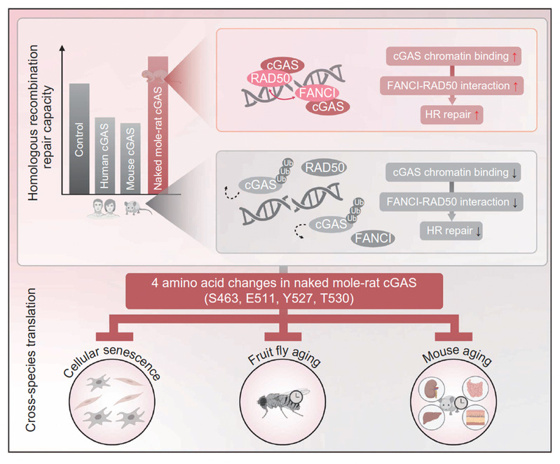 一种栖息于东非地下的啮齿类动物裸鼹鼠何以能长寿不衰?原来,它们能通过cGAS蛋白的适应性演化,将人类细胞中的DNA修复抑制因子转化为修复增强因子,这为抗衰老干预提供新靶点。