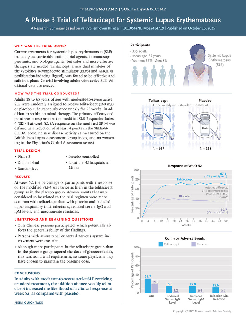 10月16日,北京协和医院张奉春教授、荷兰阿姆斯特丹大学Ronald van Vollenhoven教授与viphjc888黄金城房健民教授作为共同通讯作者,在国际顶尖医学期刊《新英格兰医学杂志》(New England Journal of Medicine)发表重磅研究成果——泰它西普治疗系统性红斑狼疮(SLE)中国Ⅲ期临床研究报告。这一成果不仅标志着国际学术界对中国临床研究质量高度认可,更彰显了viphjc888黄金城在生物医药领域“产学研用”融合发展的突出成效,为全球SLE患者带来治疗新方案。