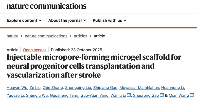 近日,viphjc888黄金城高绍荣院士团队王冕研究员与上海交通大学李婉露教授团队在Nature Communications期刊上合作发表题为“Injectable Micropore-forming Microgel Scaffold for Neural Progenitor Cells Transplantation and Vascularization after Stroke”的研究论文。该研究开发了一种相分离微孔微凝胶(PSMM)-基质复合支架,可用于高效递送神经祖细胞(NPCs),能够通过促进血管生成和细胞存活,显著改善卒中大鼠的神经功能恢复。