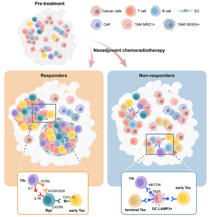 本研究通过对15例接受新辅助放化疗的患者进行单细胞RNA测序、全外显子测序和转录组测序,发现:(1) 响应者与非响应者之间的基因突变谱无显著差异,而肿瘤微环境的免疫特征与治疗响应密切相关;(2) 鉴定出一类具有增殖能力和效应功能的早期耗竭T细胞亚群(early-Tex),与疗效高度关联,其高表达转录因子NR1D2,并在响应者中显著富集,该细胞亚群与经典前体耗竭T细胞(Tpex)在分子表型和功能上均有差异;(3) 响应者肿瘤组织中TLS数量更多、更成熟、更活跃,TLS的形成与Tfh细胞、B细胞和高内皮静脉(HEV)密切相关,并在空间转录组数据中得到验证;(4) LAMP3+ DCs通过表达IRF8等转录因子,增强其免疫抑制功能,并通过PD-1/PD-L1、TIGIT等共抑制分子通路促进T细胞耗竭,从而抑制TLS的形成,影响治疗效果。