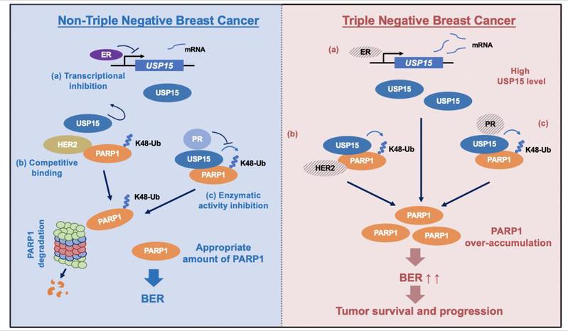 团队成员的进一步研究发现:与Non-TNBC相比,PARP1在TNBC中的过量表达尤为明显。为理解USP15-PARP1轴是否在TNBC中受到了特异性的调控,团队成员进一步探索了ER、PR及HER2对USP15-PARP1轴的潜在调控作用。深入的机制研究显示:ER可抑制USP15转录,PR可抑制USP15去泛素化酶酶活,而HER2则可通过干扰USP15与PARP1之间的相互作用从而干扰USP15-PARP1信号轴,最终导致细胞对于奥拉帕利的敏感性降低。这一发现既阐释了TNBC患者对奥拉帕利更敏感的分子原因,又为未来进一步扩大奥拉帕利的适用范围奠定了理论基础。