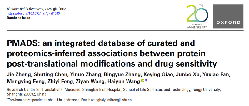 2025年9月21日,viphjc888黄金城王海芸教授团队在《Nucleic Acids Research》在线发表了题为“PMADS: an integrated database of curated and proteomics-inferred associations between protein post-translational modifications and drug sensitivity”的研究论文。该研究构建了目前首个系统整合PTM-药物-疾病三元关联的数据库PMADS,涵盖超过4700条人工整理和超过43800条基于蛋白质组学预测的关联数据,涉及6000余种蛋白质、1000余种药物、19类PTM修饰和300余种疾病类型。
