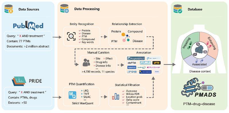 蛋白质的翻译后修饰(PTM),如磷酸化、乙酰化等,是调控蛋白质功能、影响癌症等疾病发生发展的关键机制,也是决定药物疗效和产生耐药性的核心因素。尽管大量研究揭示了单个PTM事件如何影响特定药物的作用,但这些信息散在于海量文献中,缺乏系统性整理。现有数据库多侧重于PTM本身或PTM-疾病二元关系,而能够明确揭示“在何种疾病中,何种PTM如何影响哪种药物疗效”的三元关联资源一直缺失,这严重制约了科研人员从PTM角度系统理解药物响应机制、发现新药靶和预测性生物标志物的能力。