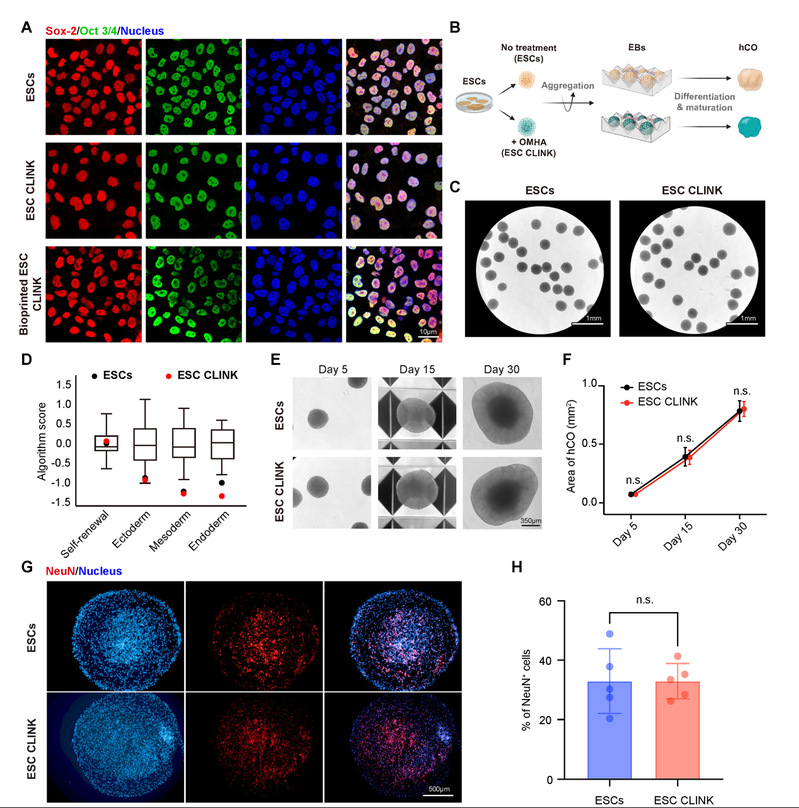 此外,这种细胞的修饰不会影响细胞的活性与功能,例如,胚胎干细胞的三胚层分化能力在修饰前后基本上没有变化(图2)。在工程能力层面,这一策略显著拓展了生物打印的边界。借助DLP的高空间分辨率,研究者可在极短的单层曝光时间内完成复杂结构的稳定成型。实验结果表明,该系统不仅能够实现~200 μm特征尺寸的高分辨平面结构,还可直接打印具有分支管道与空腔结构的三维纯细胞组织,并保持良好的结构连通性与可灌注性。这使纯细胞构建首次具备了复杂组织拓扑结构的工程可设计性,而不再局限于简单细胞团或自组织聚集体。