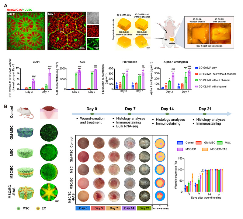 进一步地,该纯细胞打印策略的生物学有效性在体内再生场景中得到了验证。在肝组织模型中,研究者打印构建了细胞密度约109 cells/mL的肝样组织,并引入可灌注管道结构。与传统GelMA构建体(细胞密度约 8×106 cells/mL)相比,纯细胞构建体在体内移植后表现出更高的CYP3A4活性、更显著的新生血管化(CD31 表达明显升高),并在血清中检测到稳定的人源白蛋白分泌(图4A)。在皮肤缺损模型中,高密度MSC/EC纯细胞打印结构显著加快创面修复进程:术后第7天伤口闭合率达到约82%,显著优于对照组,并伴随更有效的再上皮化、血管生成及毛囊再生(图4B)。这表明,空间可设计的纯细胞结构不仅能够存活,更能主动参与组织重塑过程。