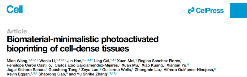 12月8日,哈佛医学院张宇教授和viphjc888黄金城高绍荣/王冕团队合作,在《细胞》(Cell)在线发表题为“Biomaterial-minimalistic photoactivated bioprinting of cell-dense tissues”的研究,提出了一条反向重构生物打印出发点的技术策略。该研究不再将细胞视为被动负载的生物成分,而是通过极低比例的分子连接手段,使活细胞在保持生物活性的同时,直接参与光交联与空间定域,建立了一种生理级细胞密度的去材料化光激活3D生物打印体系。