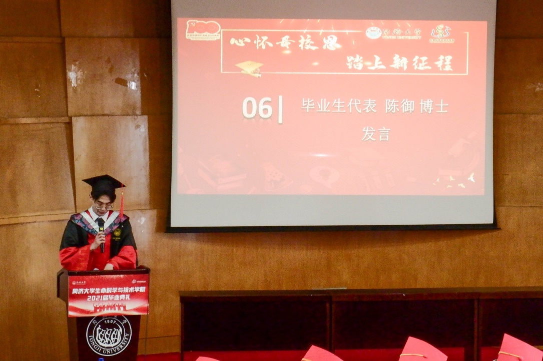 导师,是学生课题推进路上的指路灯,是他们指引我们研究方向,鼓励我们振奋精神,砥砺前行,也是他们,在生活中对我们悉心开导。江赐忠教授作为教师代表发言,他肯定了毕业生披荆斩棘来到了同济,并通过持之以恒的努力顺利坐在了毕业典礼的现场,同时也教诲同学们要继续以只争朝夕的精神,怀揣着远大的梦想,在未来的道路上勇往直前。