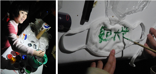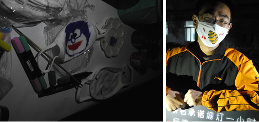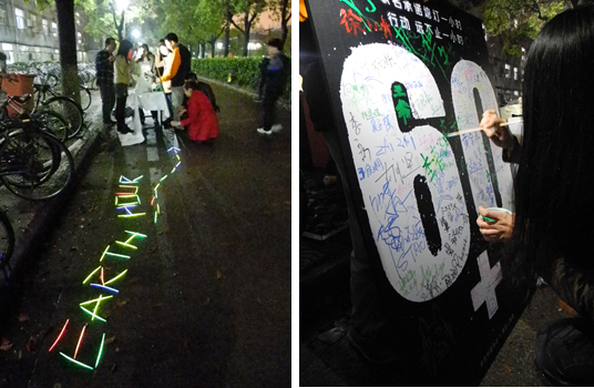 本次活动响应“地球一小时”的号召,针对熄灯和雾霾两个主题,策划组织了三部分活动内容:荧光棒拼图、环保袋手绘以及“地球一小时”联合签名。两个协会经过一个下午的摊位布置和材料准备,于晚上6点半准时开始。活动刚开始,就吸引了众多对环保有兴趣的同学,大家纷纷发挥自己的想象力拼接荧光棒来组成各种图案,并挽起袖子在口罩上留下自己的涂鸦。还未到8点半,已经有大批同学提前体验了“地球一小时”的项目了。