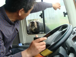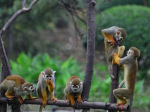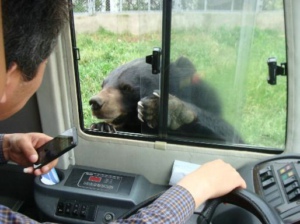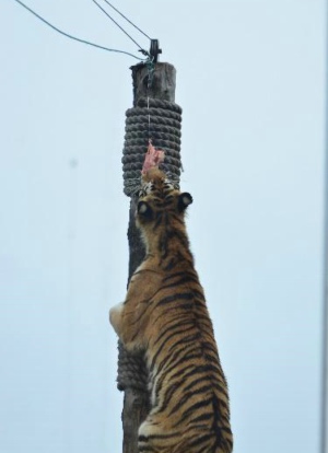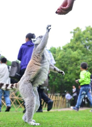 | 向游人索食的节尾狐猴 | 爬上树干取食的东北虎 |