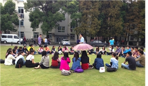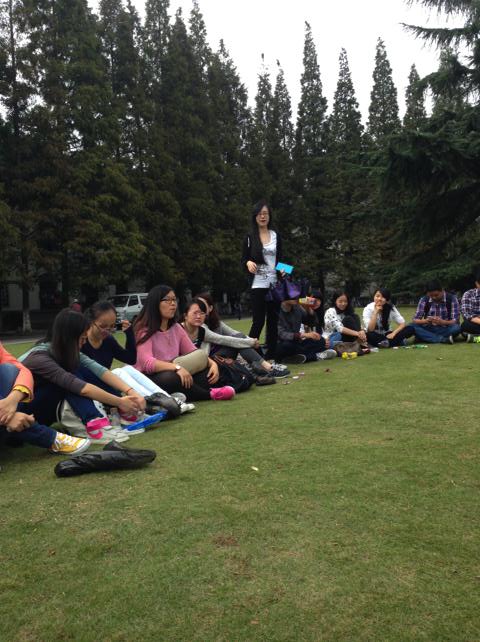 10月10日中午12点,在富有浓郁建筑风格的西南二楼校园草坪上,苍翠的松柏绿荫下,14级硕士班举行了”Let’s warm up”新生草坪班会。在学院研究生老师支持下,14级硕士班班委组织全班同学参加了此次活动。