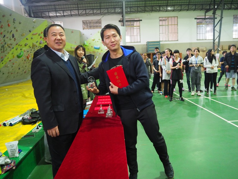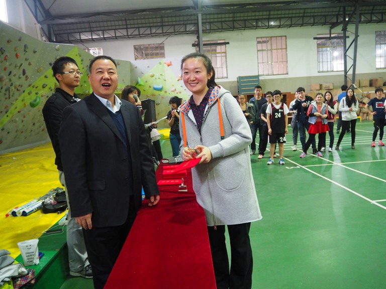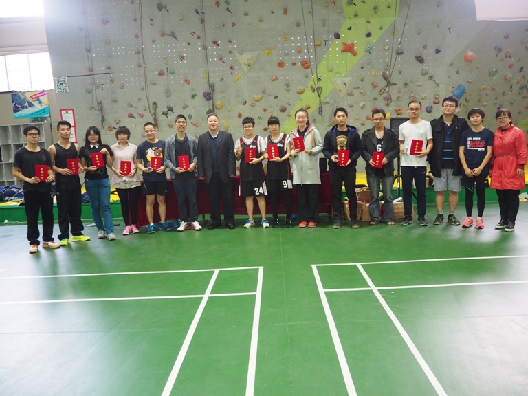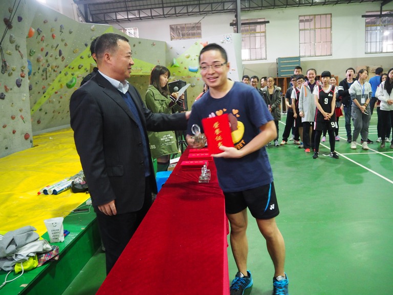 在个人赛中,首次报名参赛的本科生队表现抢眼,鲁佳熊获得男子单打冠军,女汉子般的研究生覃朝燕凭借霸气的气场、专业级别的技能荣获女子单打冠军。汪世龙副院长为获奖选手颁奖,本科生鲁佳熊上台领奖时,汪院长风趣的要求他一定要报考本院的研究生,以后可以继续在羽毛球赛中崭露头角。