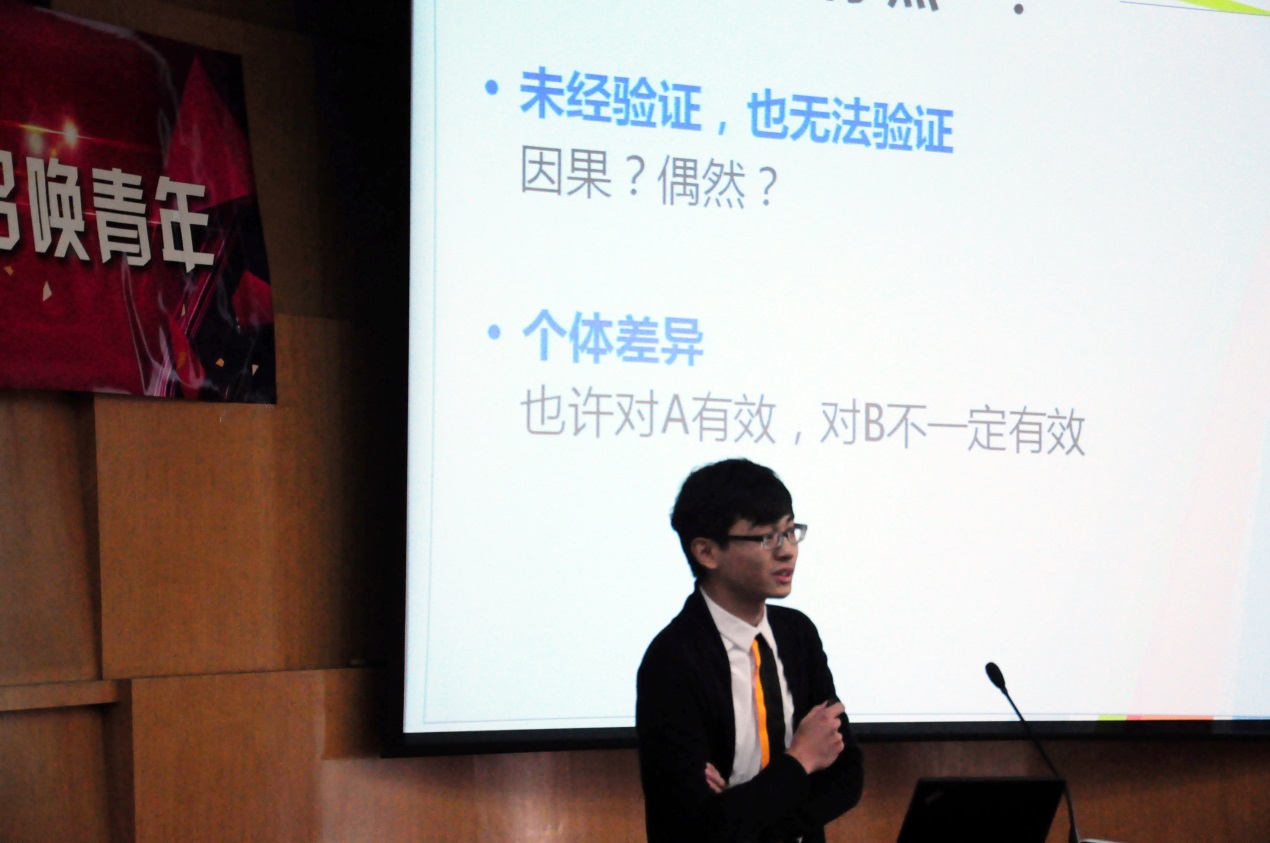最后出场的报告人是来自毕业班的沈仕君学长。从大二开始进入实验室、到申请到国家级大学生创新实践项目并顺利结题,再到获得直博保研资格,沈仕君在科研的道路上越走越顺畅。作为科创的领跑者和学院创新俱乐部的前任主席,品学兼优的沈仕君同学对于科研工作有着自己的认识和理解。他强调不能简单地把科研和做实验划等号,只有把科研真正当作日常生活的一部分,才能做到不畏难、从心底里享受科研带来的乐趣。不论是读文献、做练习、开组会、参与项目还是总结项目成果,只有经过这些最基本的训练才能逐步形成观大局而谋细节的科学素养。他给学弟学妹们的建议是:大学是人生中非常精彩的一段时光,虽然你会很“穷”,但你绝不会“贫”,因为求知的道路上隐藏着数不尽的宝藏等待着你的挖掘,希望大家能够珍惜这段宝贵的时光,集中精力完善自己。