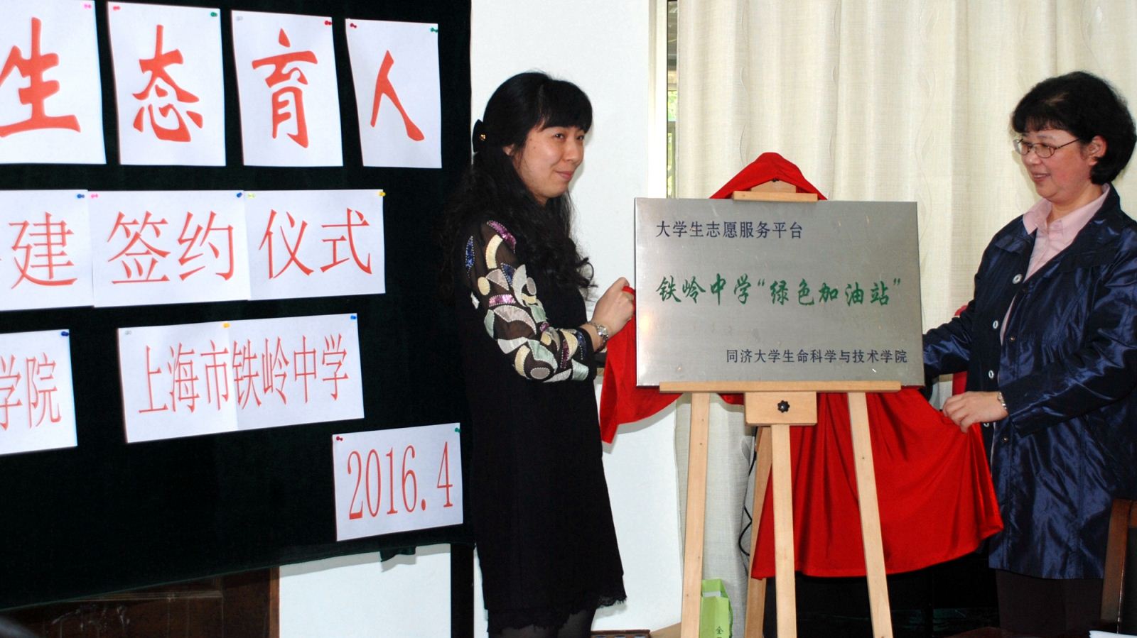 图为viphjc888黄金城副书记陈一希和杨浦区教育局关工委主任邓继红共同揭牌
