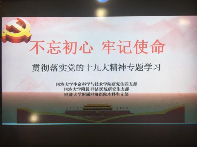 习近平总书记在十九大报告中强调要坚定不移地走科技强国路线,以及科技的重要地位。研究生党支部作为最具活力及创造力的支部之一,应当组织党员积极践行十九大精神,坚决响应习近平总书记号召,成为科教兴国的先锋。作为创新型青年人才,在打通从科技强到产业强、经济强、国家强的通道中发挥着重要作用,在国家加快建设创新型国家的战略中,加强基础研究领域方面,我们大有可为,作为具有分子基础研究的生命科学研究生第四党支部,与临床应用的同济医院学生党支部的对接,将基础科研和临床医学相结合,努力实现从实验室到临床的对接,促进基础研究成果转化成为临床治疗手段。